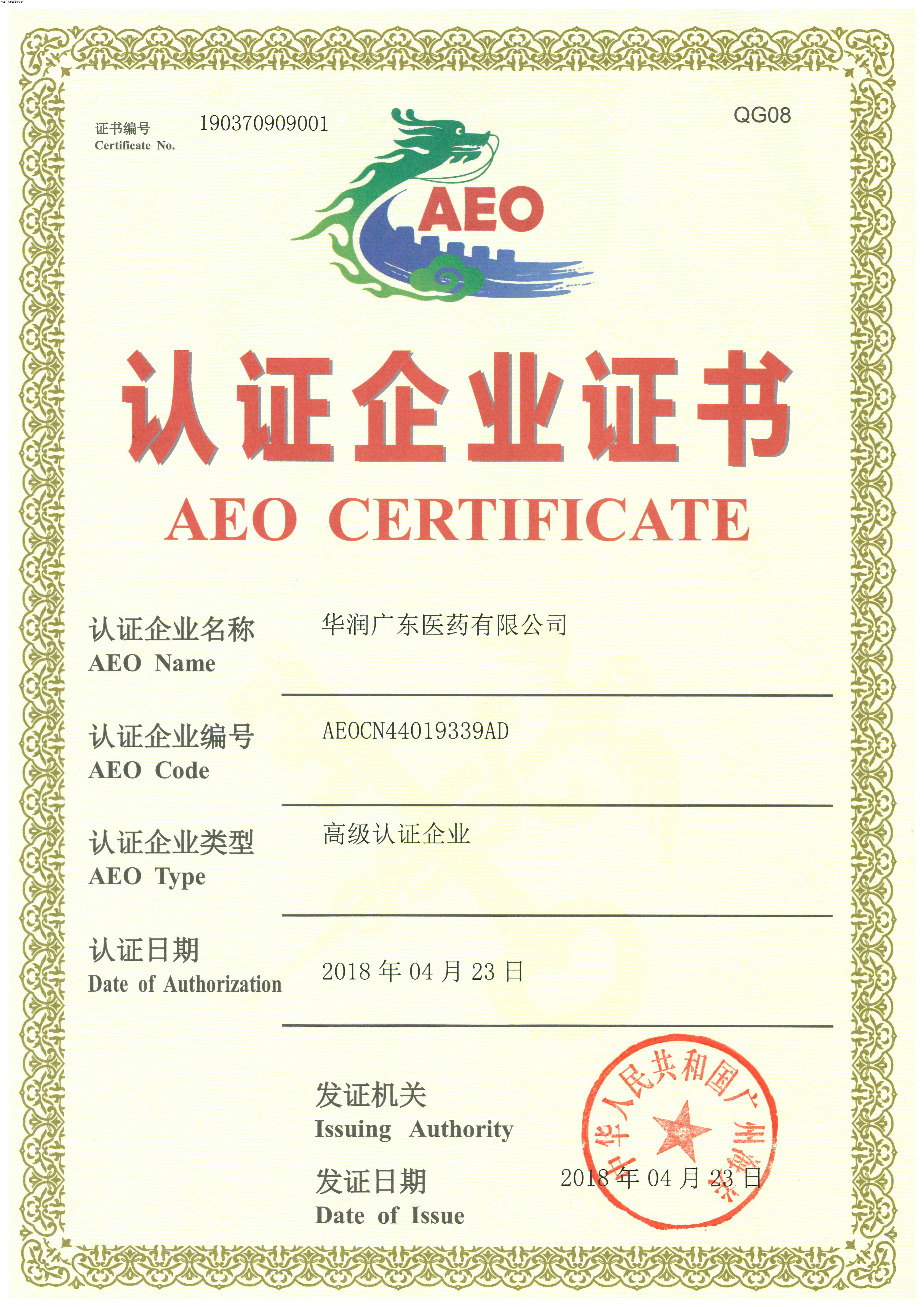 近日,經(jīng)廣州海關(guān)來司的現(xiàn)場審核和批準,華潤廣東醫(yī)藥有限公司順利獲發(fā)海關(guān)AEO高級認證企業(yè)證書。