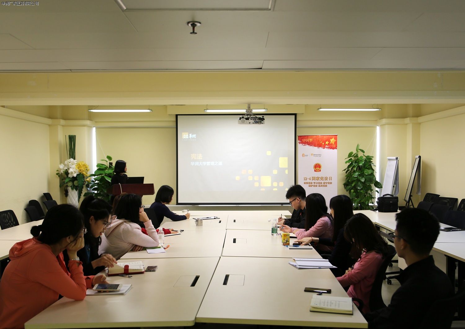 華潤廣東醫(yī)藥舉辦“12.4日國家憲法學(xué)習(xí)培訓(xùn)會”,各部門合同管理員一同觀看《憲法宣傳片》和《依法治國宣傳片》視頻,同時廣東公司法務(wù)專員蕭賢麗借助華潤集團(tuán)法律事務(wù)部何書泉律師制定的憲法課件,圍繞憲法的概念和特征、憲法的傳承演變、憲法的基本內(nèi)容以及2018年憲法修改的主要內(nèi)容進(jìn)行講解,并從實際出發(fā),列舉了工作和生活中與憲法息息相關(guān)的事例生動說明憲法與企業(yè)、個人是密不可分的。
