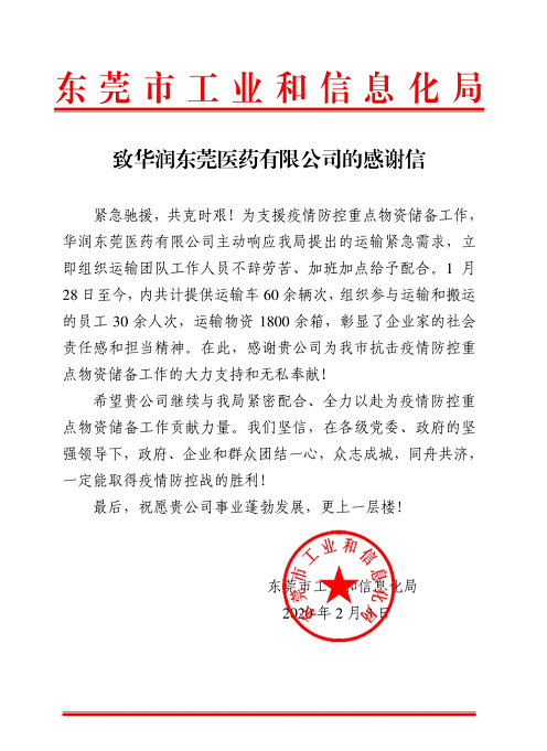 這封感謝信來自東莞市工業(yè)和信息化局,傳遞了東莞市工業(yè)和信息化局對華潤東莞醫(yī)藥提供高效、積極及專業(yè)的物流配送的感謝,也鼓舞了華潤東莞醫(yī)藥此刻為疫情應(yīng)急物資運輸工作努力奮戰(zhàn)的團隊信心。