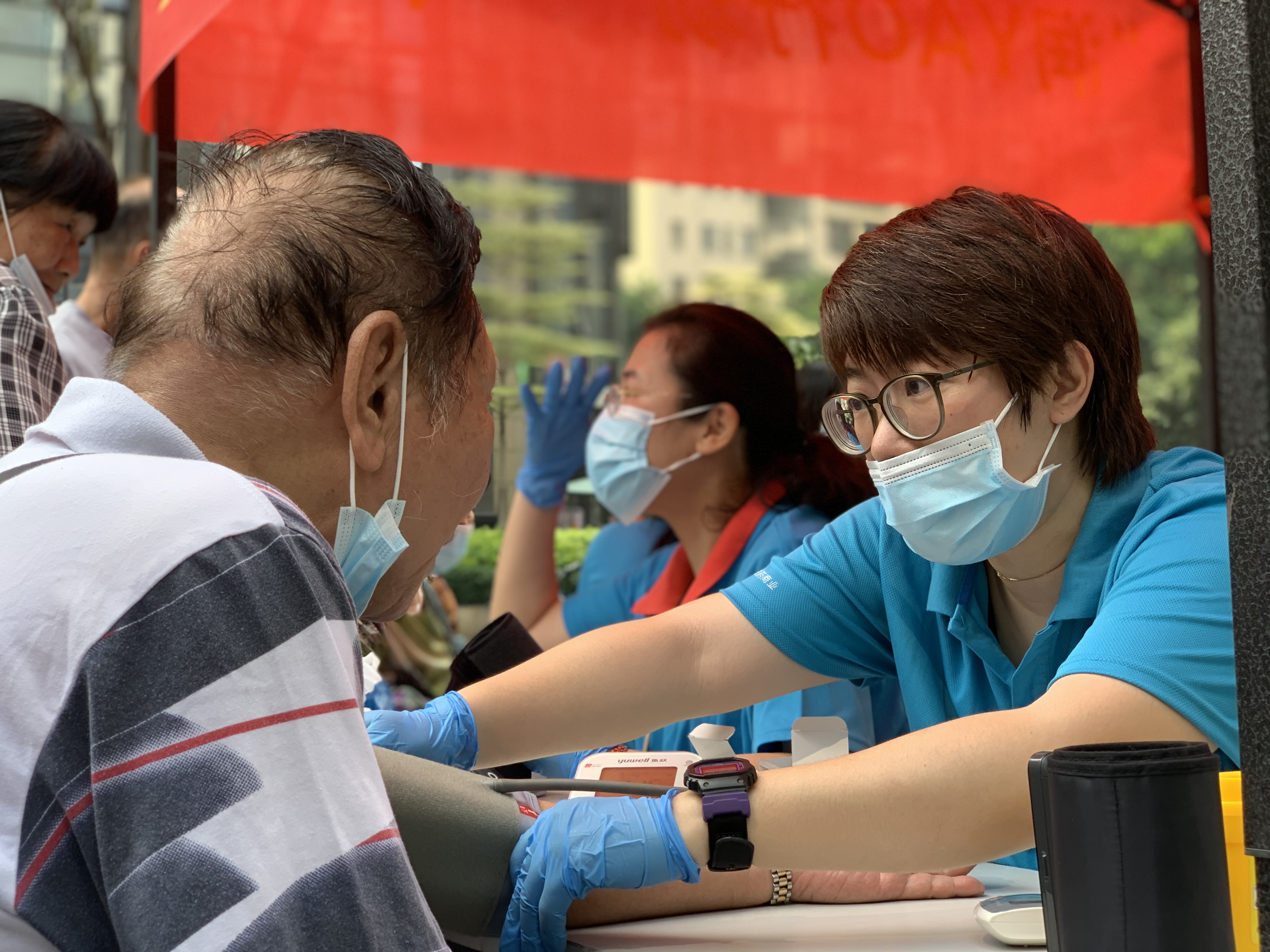 此次活動,志愿者們?yōu)槿罕姕蕚淞藴y血糖、量血壓的項目,以及為群眾提供慢性病咨詢。“伯伯,你血壓有點高,你記得注意下飲食呀,不要吃高脂肪的食物,要忌口?!鼻嗄挈h員羅曉媚看了看血壓儀,和氣地向老先生勸導(dǎo)?;顒悠陂g,前來參與活動的群眾絡(luò)繹不絕。華潤廣東醫(yī)藥與廣州德信行大藥房黨員志愿者們?yōu)椴还钾撊罕姷钠谕?,不讓群眾白跑一趟,攤位活動一直維持到11點45分才正式收攤。